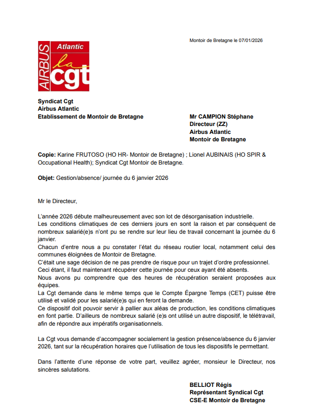 Courrier à la Direction pour la gestion du 06 Janvier 2026.